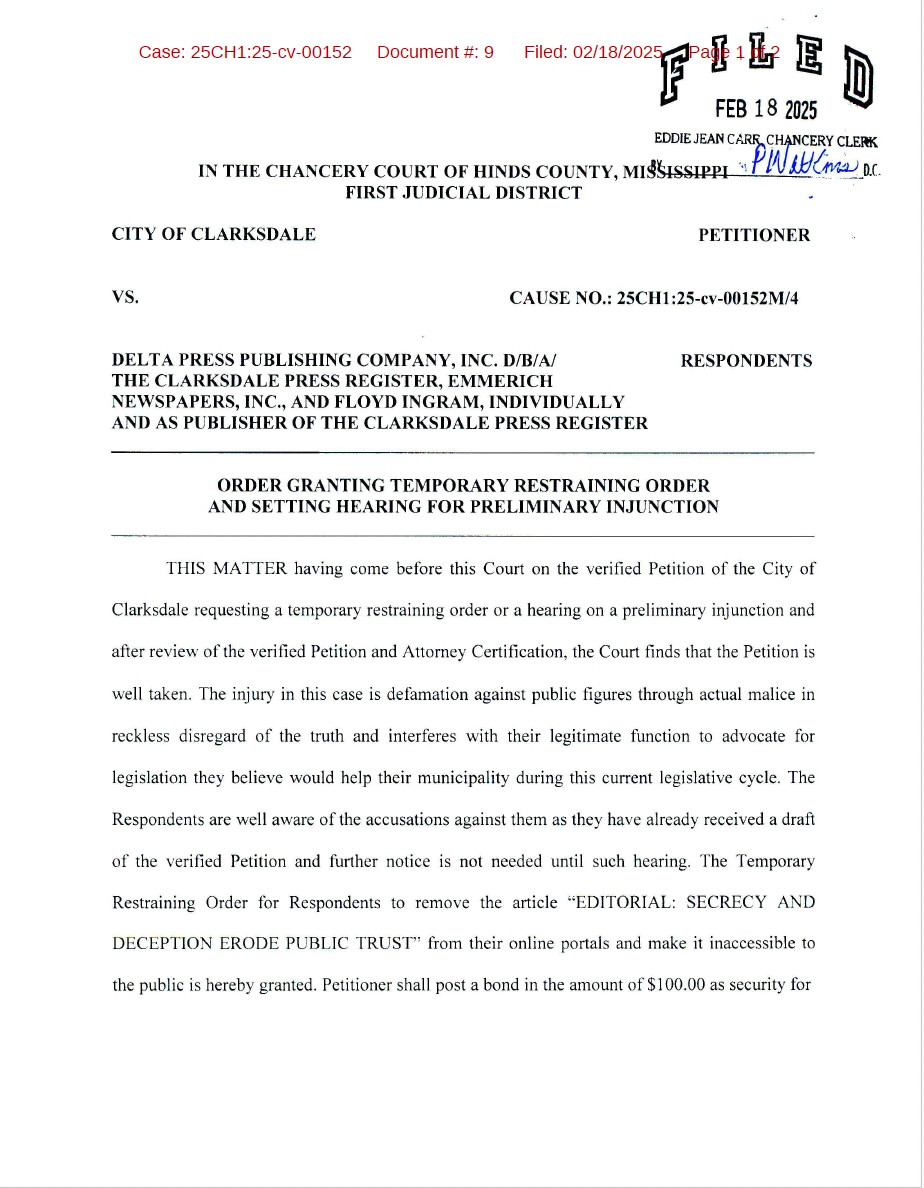 The City of Clarksdale, Miss., violating longstanding United States defamation law, sued their local newspaper for defamation. Note for the peanut gallery: the United States has never, and will never, recognize the right of the government to sue for defamation. Only private persons may do that.